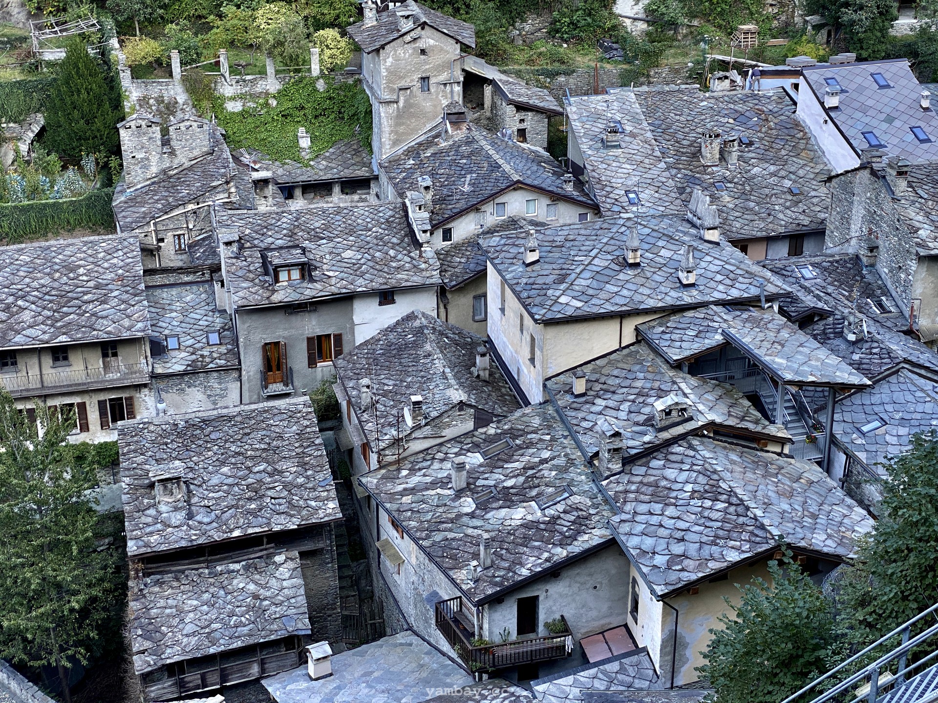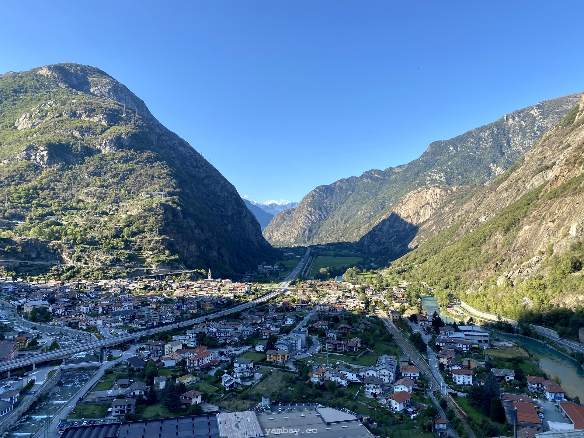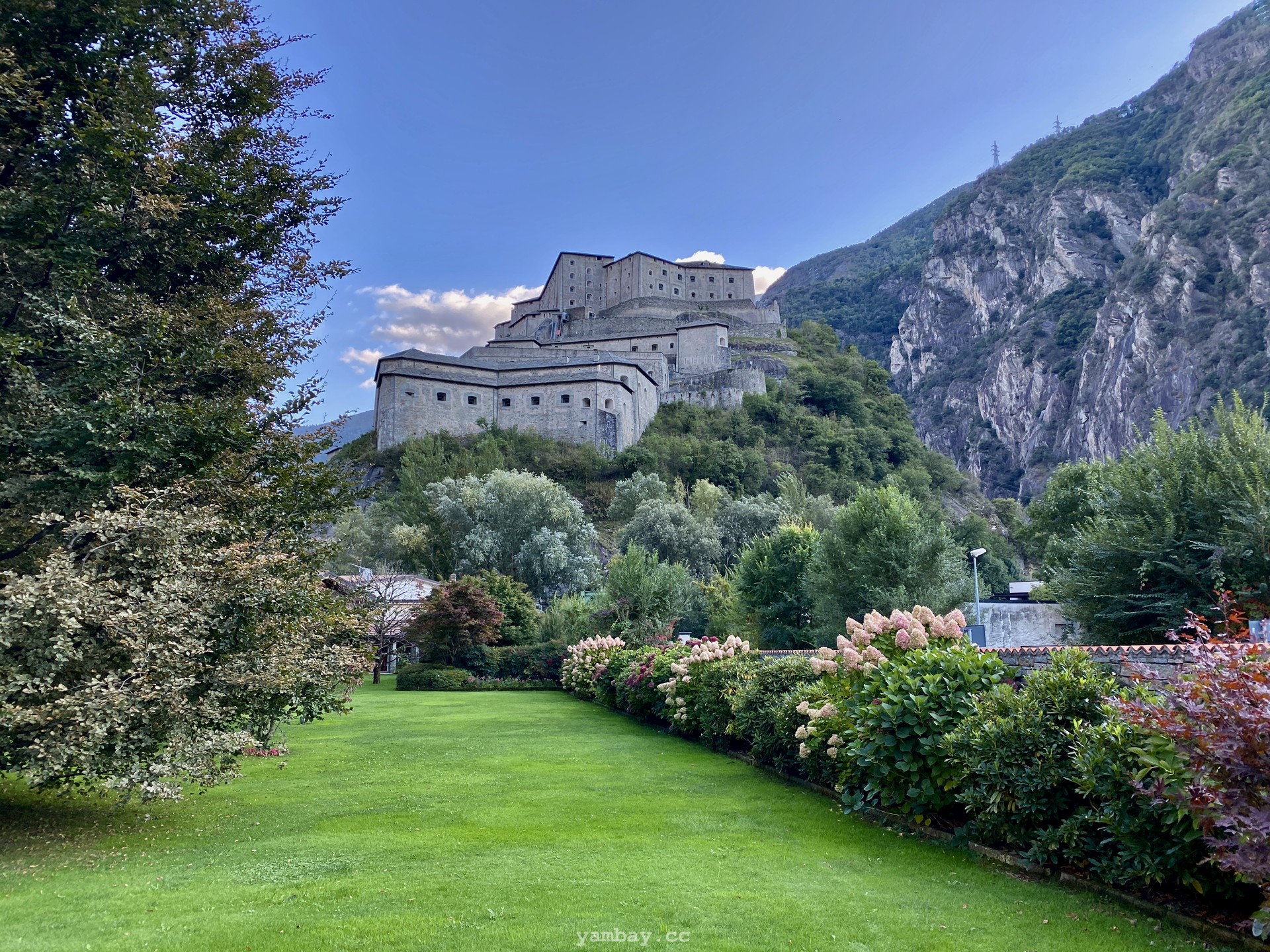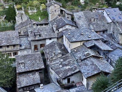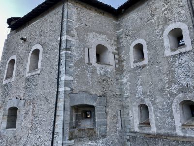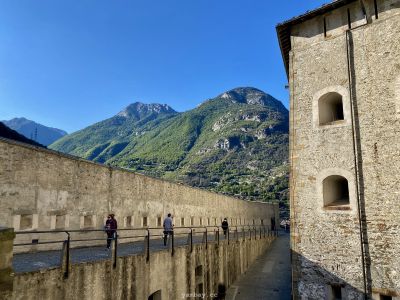 Впечатления усиливают виды из бойниц крепости. Вот под тобой серые крыши деревенских построек. А вот вдали впереди, в конце долины виднеется хребет, где-то слева от которого спрятался Монблан, а справа перевал Сан-Бернардино, соединяющий Италию и Швейцарию. Снежные вершины, зеленые виноградники (да-да! даже виноград там выращивают!), старые каменные домики из грязно-серого камня, современные дома - все это видно из крепости.