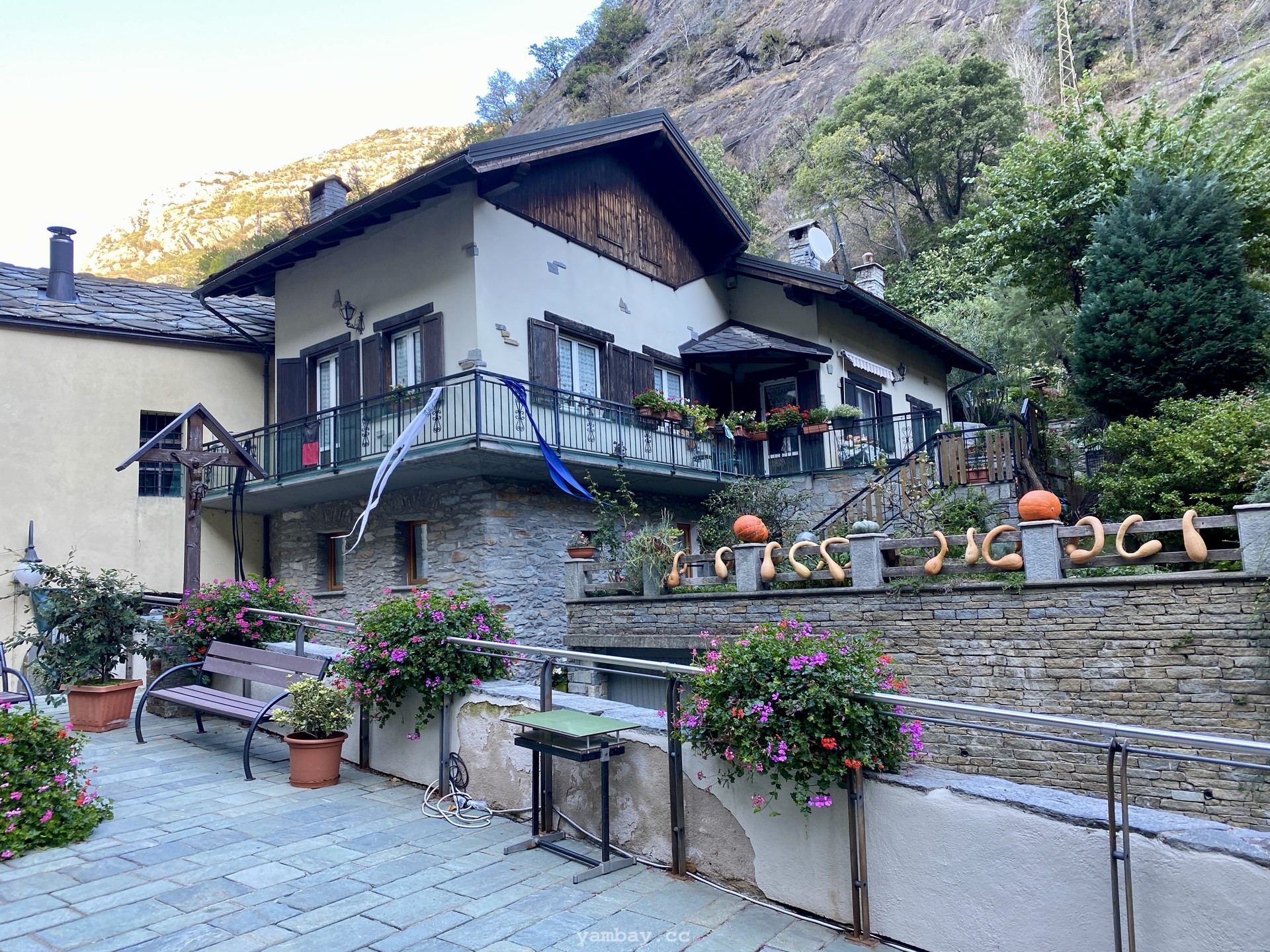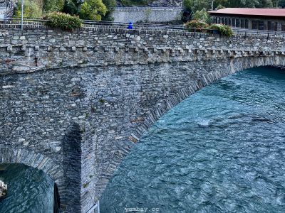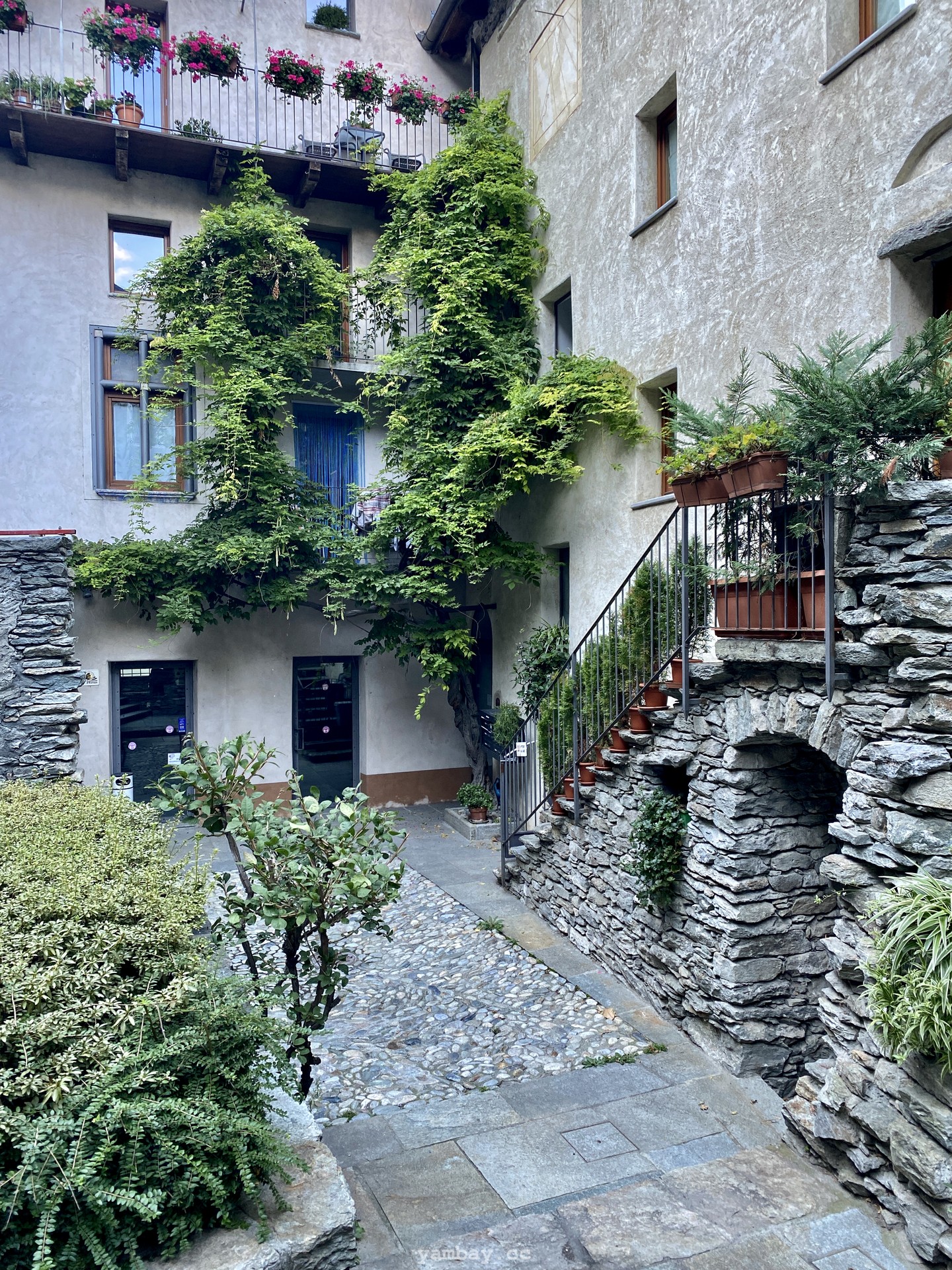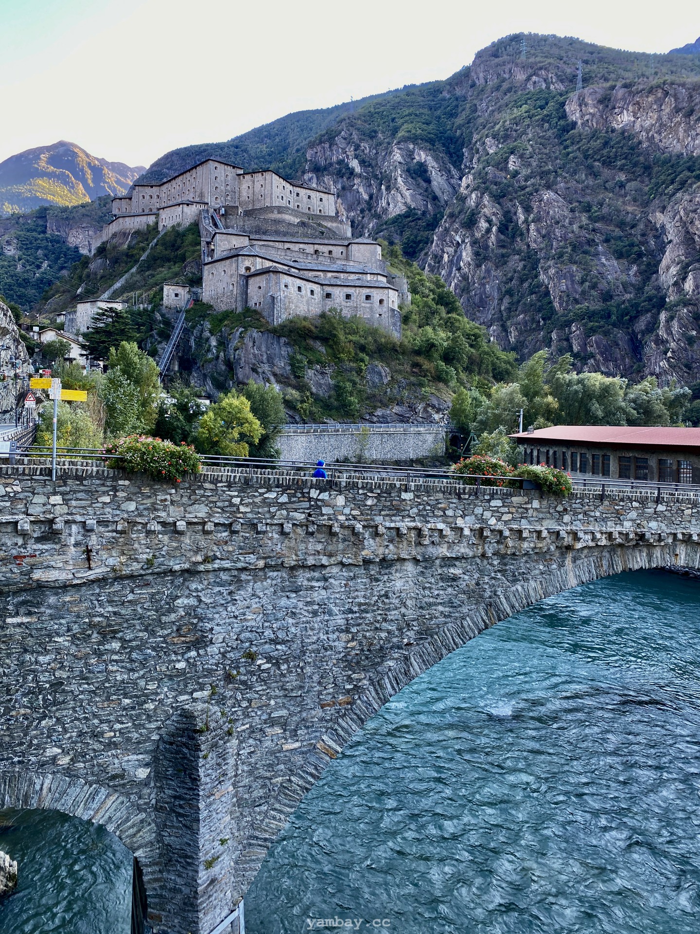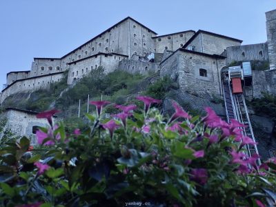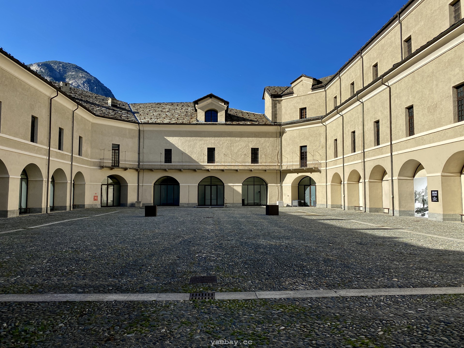 Впечатления усиливают виды из бойниц крепости. Вот под тобой серые крыши деревенских построек. А вот вдали впереди, в конце долины виднеется хребет, где-то слева от которого спрятался Монблан, а справа перевал Сан-Бернардино, соединяющий Италию и Швейцарию. Снежные вершины, зеленые виноградники (да-да! даже виноград там выращивают!), старые каменные домики из грязно-серого камня, современные дома - все это видно из крепости.