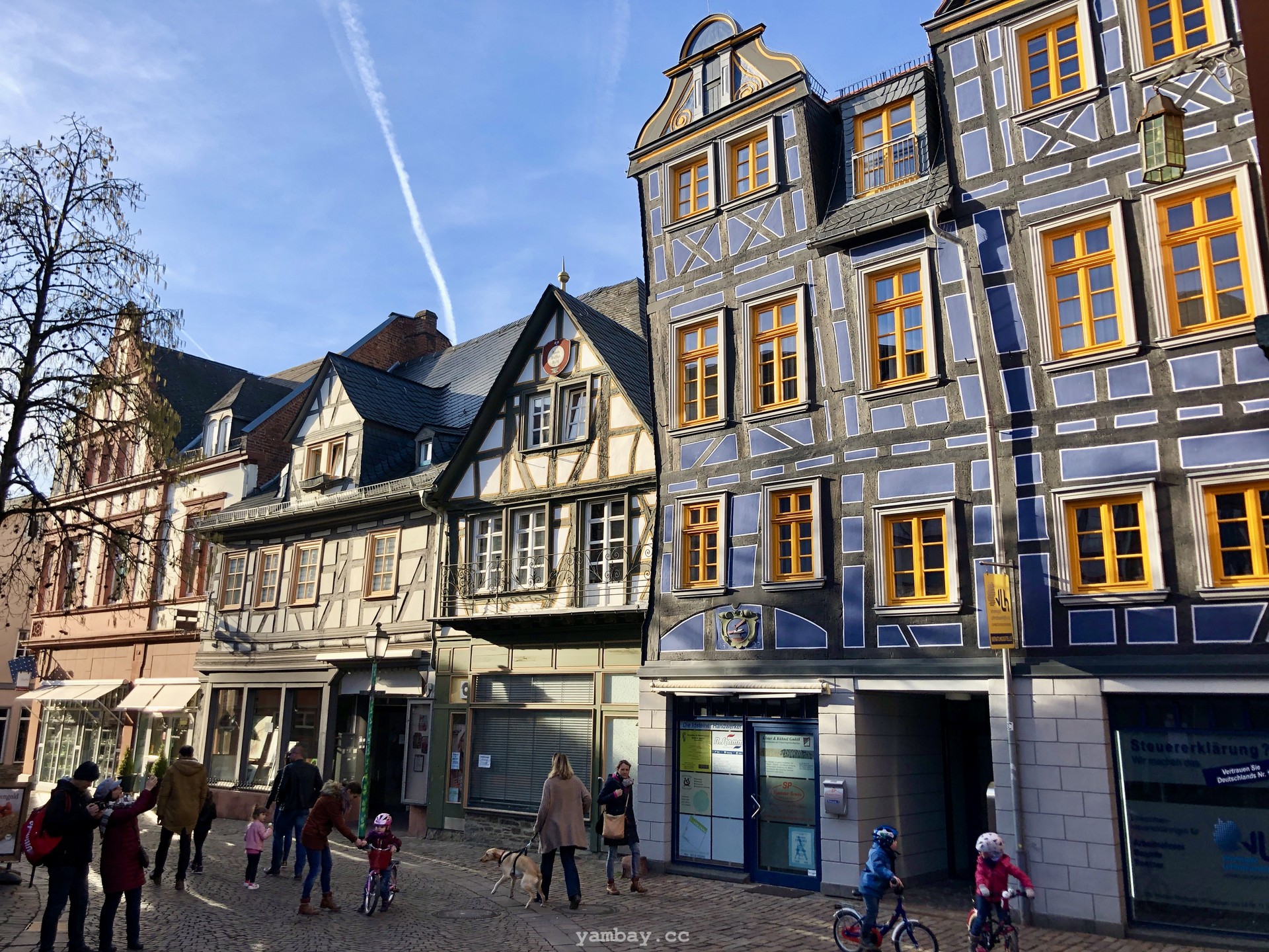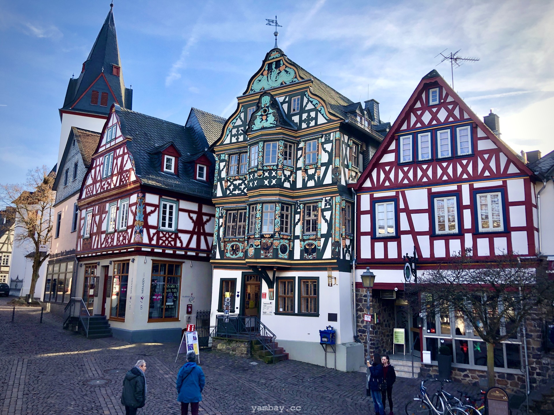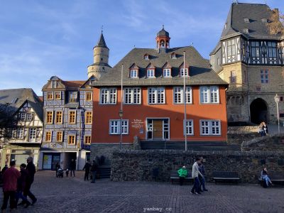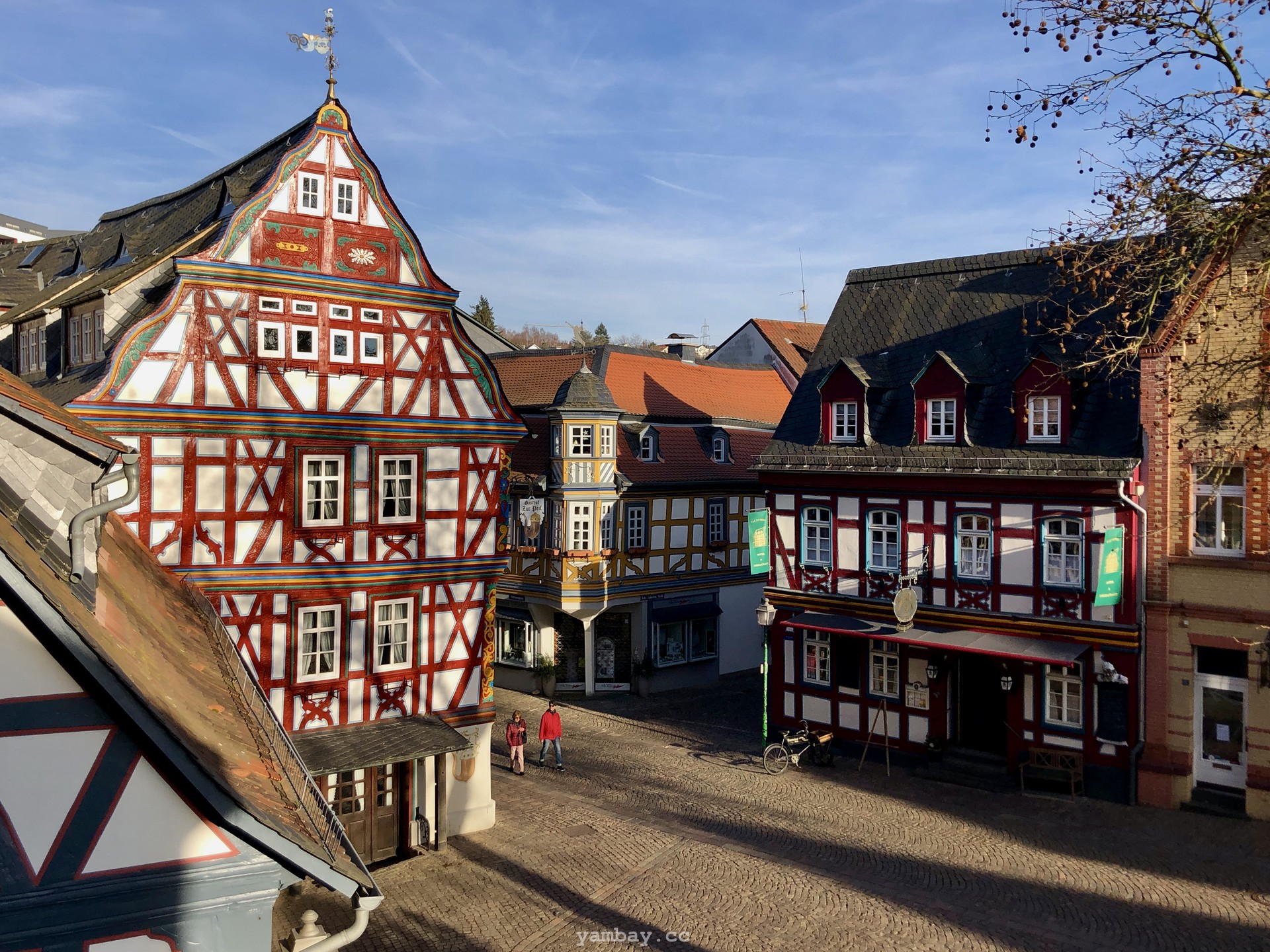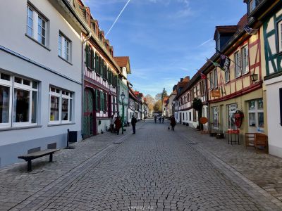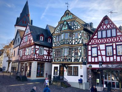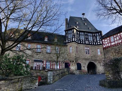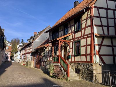 Перво-наперво подкрепились в булочной недалеко от центра, где оставили машину. А выйдя из булочной, оказались в пешеходной зоне, втиснувшейся среди слегка покосившихся цветастых фахверковых домиков. Здания в небольшом историческом центре прекрасно сохранились, были хорошо отреставрированы, ярко выкрашены. В тот солнечный день архитектурная палитра смотрелась особенно эффектно. Там же есть старая крепость и бывшая резиденция одной из ветвей некогда влиятельной Нассауской династии.