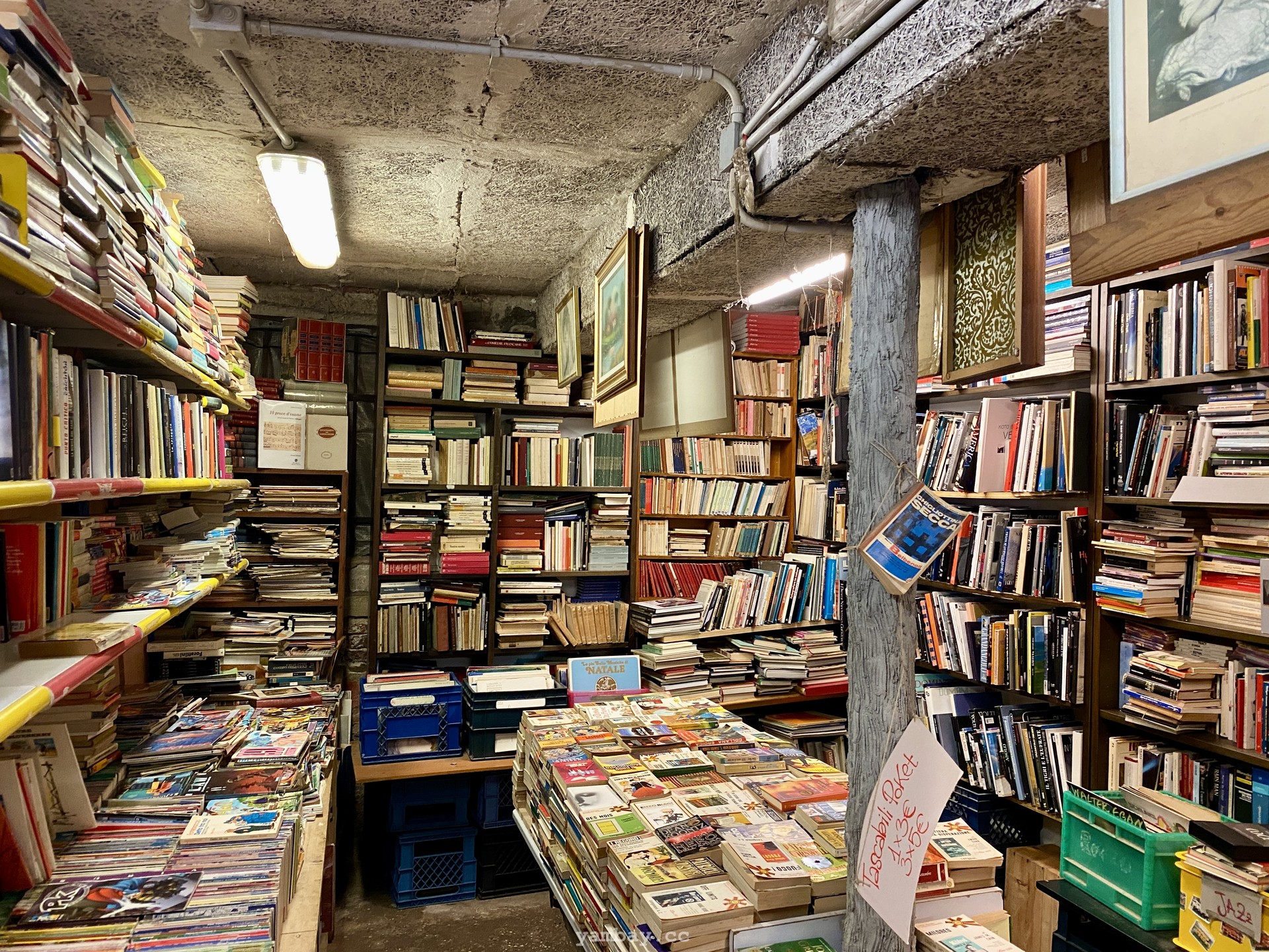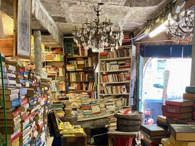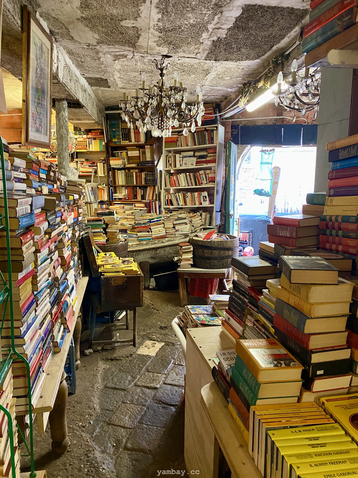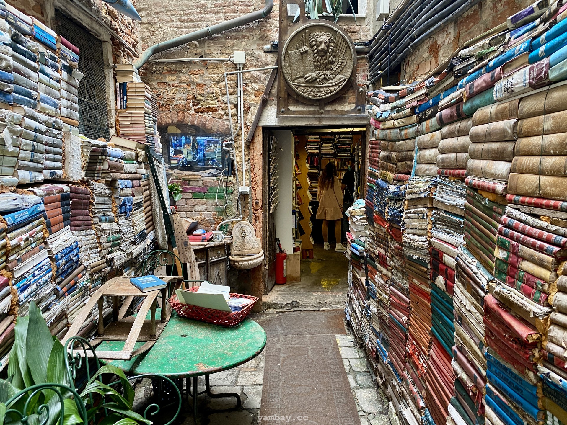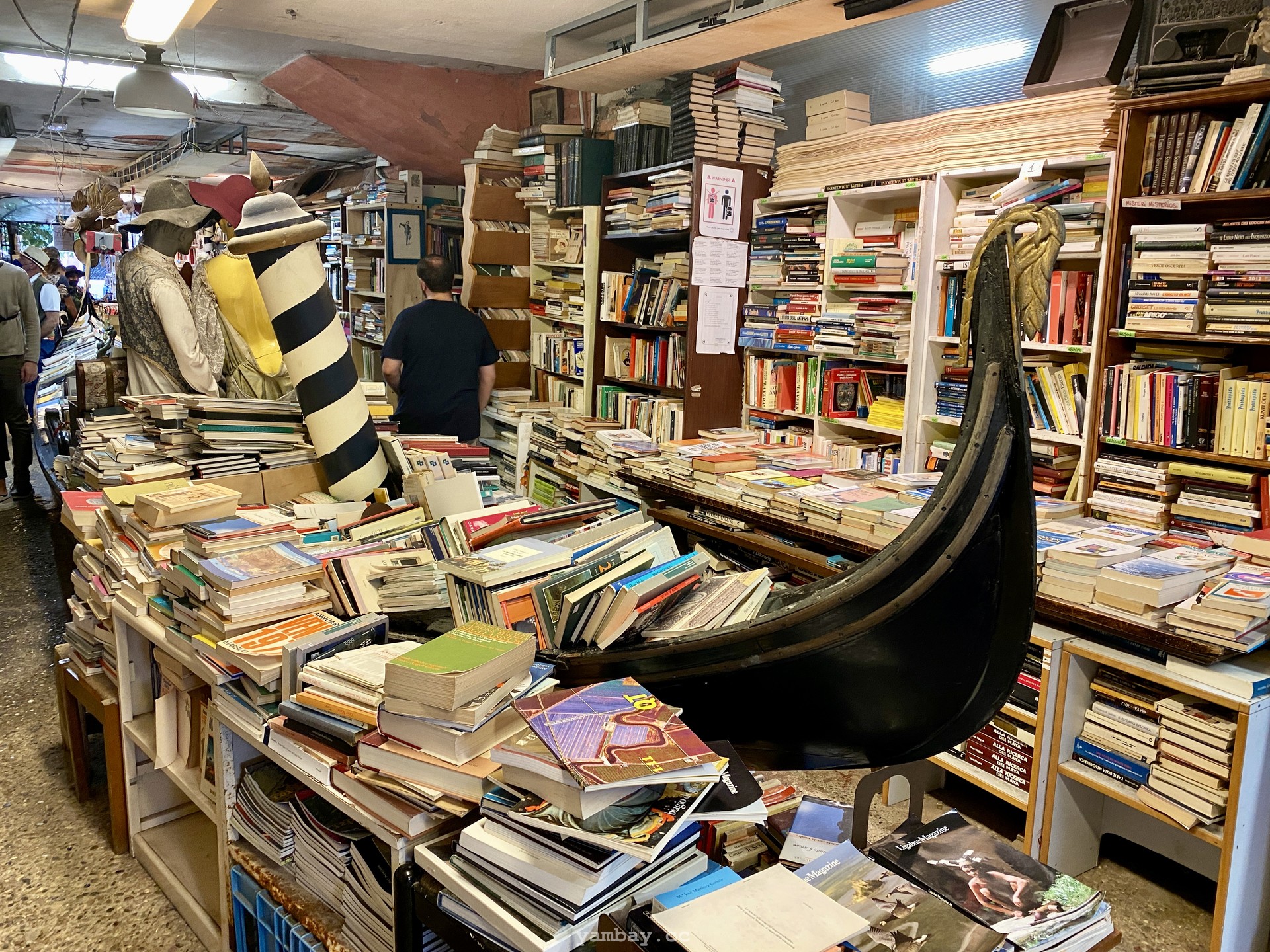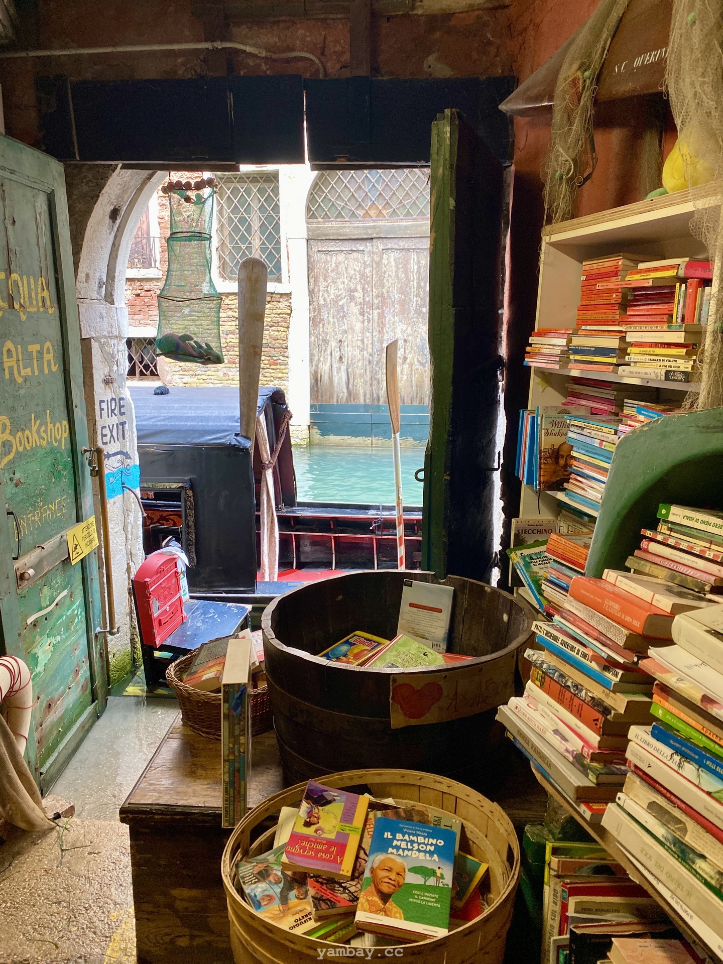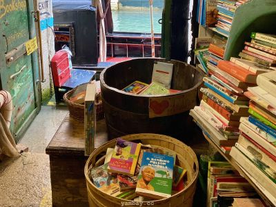 Одно из таких мест - старая книжная лавка Libreria Aqua Alta в Венеции. Здесь, наверное, не найдется двух одинаковых книг; в большинстве своем книги не новые, уже кем-то читанные, со своей историей. Это место - некий симбиоз буккроссинга, музея, блошиного рынка и туристического уголка. Посреди магазина - гондола заваленная книгами :) Внутренний дворик видно из переулка из-за решетчатого забора, и этот дворик несомненно привлекает внимание туристов. А из самой дальней комнаты можно ступить в пришвартованную гондолу и уплыть в закат. Наверное.